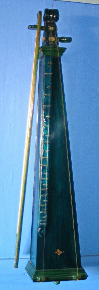 Höfuðið er úr einu eikarstykki úrgreyptu að framan og ganga stillararnir sem eru tveir þar í gegn. Annar er úr eik en hinn úr furu. Efst á höfuðið er skorinn líkt og vindingur er vinst fram á við. Niður úr kassanum gengur tappi, líkur stillara að gerð, og virðast strengirnir hafa verið þrír enda er á höfðinu nagli sem miðstrengurinn sýnist hafa verið festur í. Einungis einn strengjanna hefur þó legið yfir nótnastykkið, sem er þunn fjöl með látúnslykkjum, fest á aðra rönd kassans.