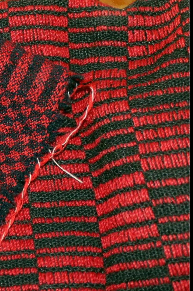 Ofinn renningur. 65 x 7 cm að stærð. Hann er ofinn úr rauðu ullarbandi í svart. Munstrið er kantað. Þetta er hluti af ábreiðu/rúmteppi.