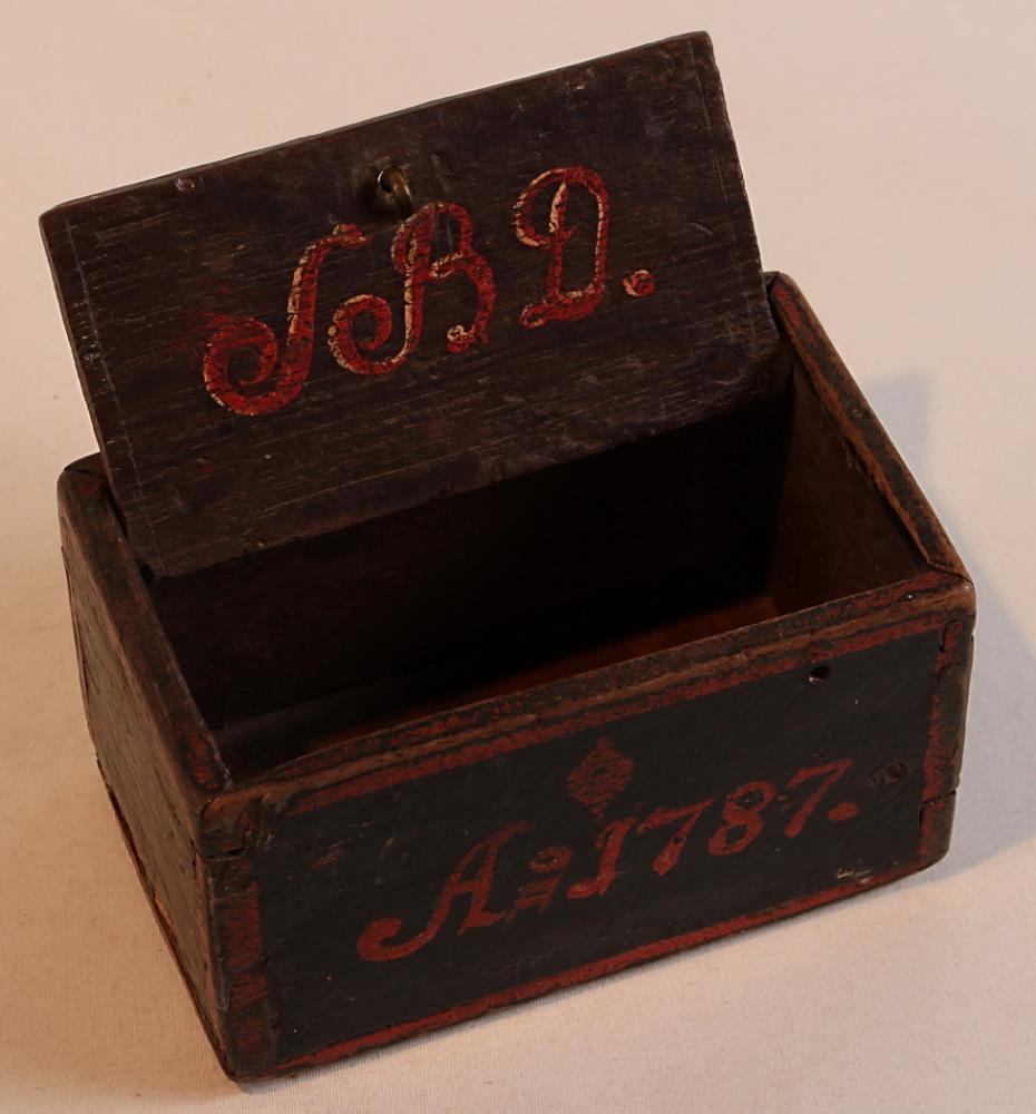 Smákistill úr furu eða brenni, málaður svartur og rauður. Tvínegldur. Lokið fellur ofan í kistilinn, fest með tveim tréeyrum inn í hliðarnar sitt hvoru megin. Stærð á lokinu 10,3 x 5,6 cm. Á lokið er málaður rauður túlípani. Krókurinn á lokinu er úr kopar. Á innanvert lokið er málað með rauðum stöfum J (eða S) B D. En framan á kistilinn er málað með rauðum stöfum A-1787 og málaður rauður þríhyrningur þar fyrir ofan líkt og skráargat.