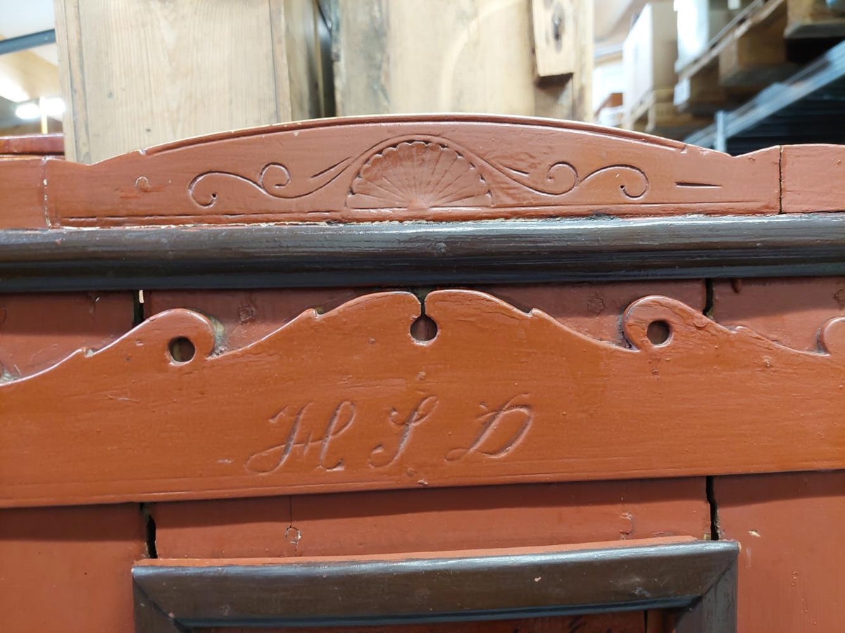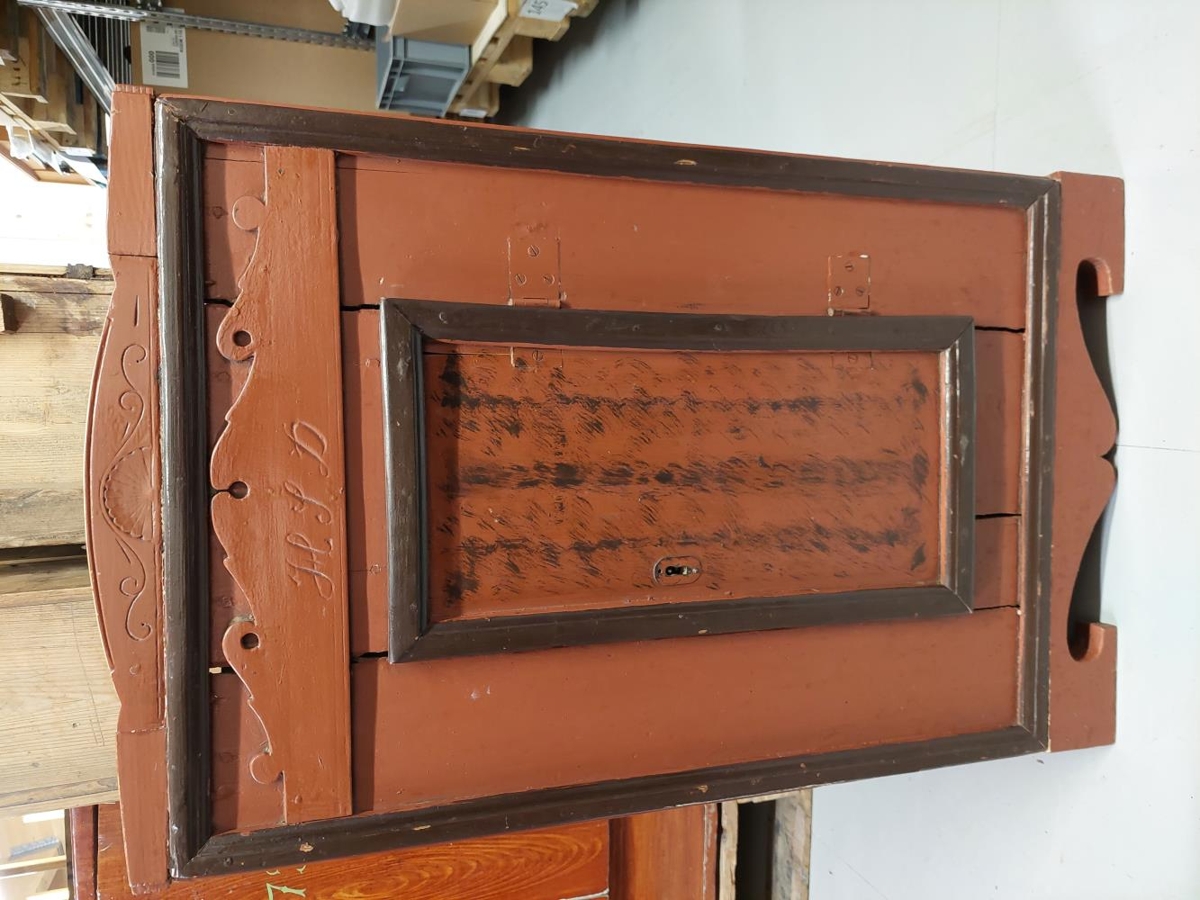 Hurðajárn eru góð. Yfir hurð er útskorin þunn fjöl með ágröfnum stöfum: H S D. Ofan á efsta listanum er stykki þar sem á er útskurður sem líkist páfuglastéli.