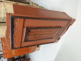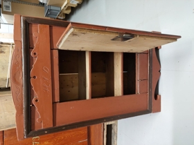 Fótstykkið er útskorið og myndar mynstur á hliðum og framan. Listar eru umhverfis hurð, á hurð strikaðir (rauðir) dökkbrúnir að lit. Skápurinn er allur í ljósbrúnum lit að öðru leiti nema hurðin sem er með einskonar oðringu (eikarmálun).