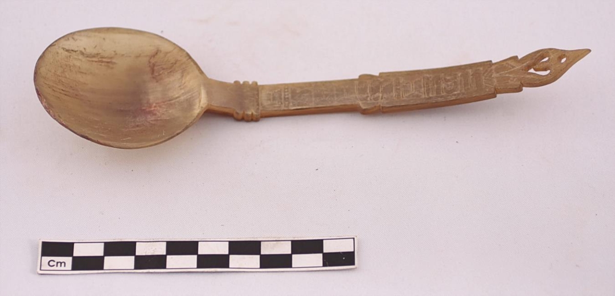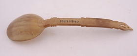 Spónn úr lambhrútshorni, dálítið sprungið í skálina. Töluvert bogin séð á hlið. Glæsilegur gripur með fallega skornu letri „G. SVEIN. Á 1911." Haldið er allt útskorið. Lengd skeiðarinnar 17,9 cm. breidd á haldi 1 cm. Þykkt mest 0,4 cm. Skálin er 5,9 cm löng og 5 cm á breidd. Örlítið ílöng. Hornspóninn gerði Páll Þórðarson á Sauðárkróki. Guðrún Sveinsdóttir frá Bjarnastaðahlíð átti spóninn.