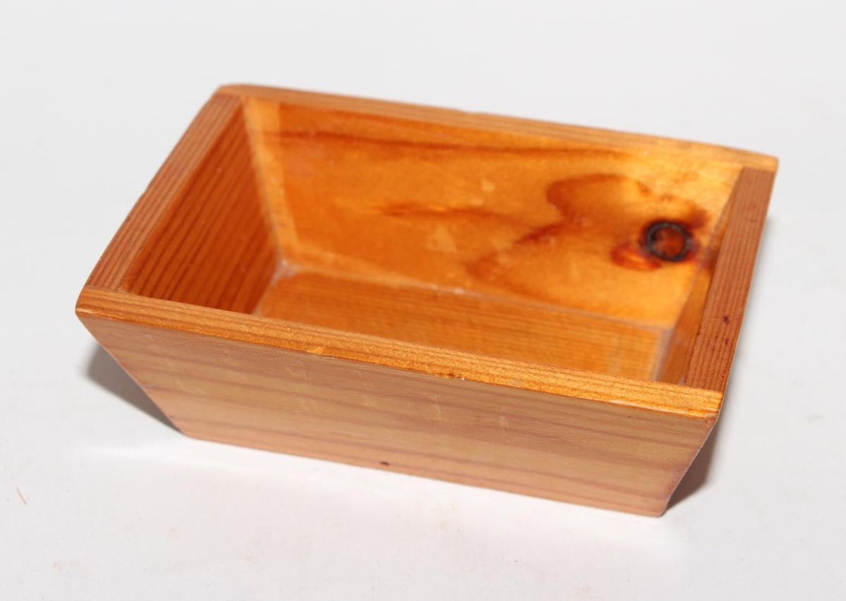 Líkan af trogi úr furu. Efri hluti er 10 x 7 cm og neðri hluti er 4 x 8,5 cm. Hæðin er 3,9 cm. Límt, neglt og lakkað.