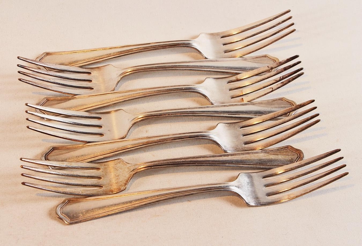 7 gafflar úr stáli. Lengd 18 cm, breidd mest 2,5 cm, strikaðir meðfram jöðrum. Aftan á þeim stendur: „MADE OF STEEL OO“, með silfurhúð.