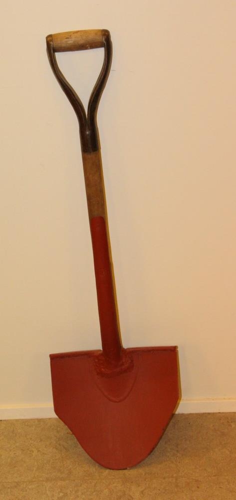Skófla. Járnblað 28 x 21 cm á tréhaldi. Lengd alls 97 cm. Blaðið er þykkt og soðið á allsvera brún. Þetta er greinilega einhvers konar stunguskófla en hún er óvenjulega breið og blaðið er lítið eitt íhvolft. Búið er að bera rauða verju á allt járnið, nema haldið.