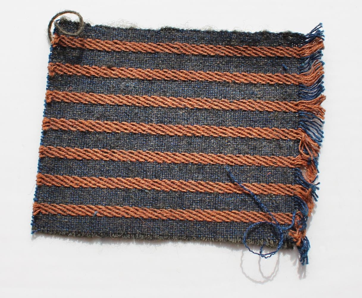 Vefnaður (sýnishorn). Ofið úr ull. Litir blár og brúnn. Búturinn er köflóttur með mislangar hliðar, 15 x 6,2 cm.