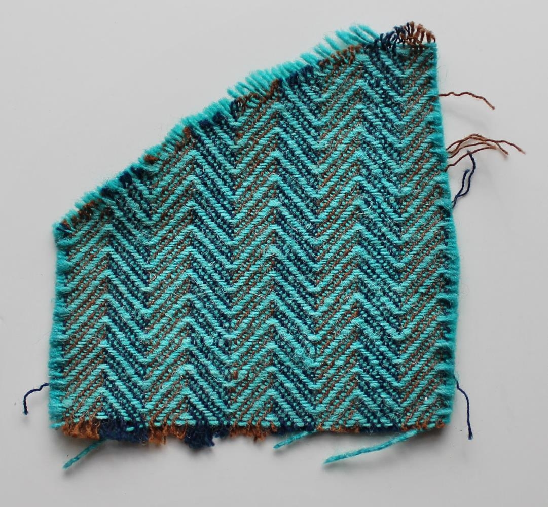 Vefnaður (sýnishorn). Ofið úr ull. Litir blár, grænn og brúnn, bylgjótt. Búturinn er 7,5 x 7,3 cm.