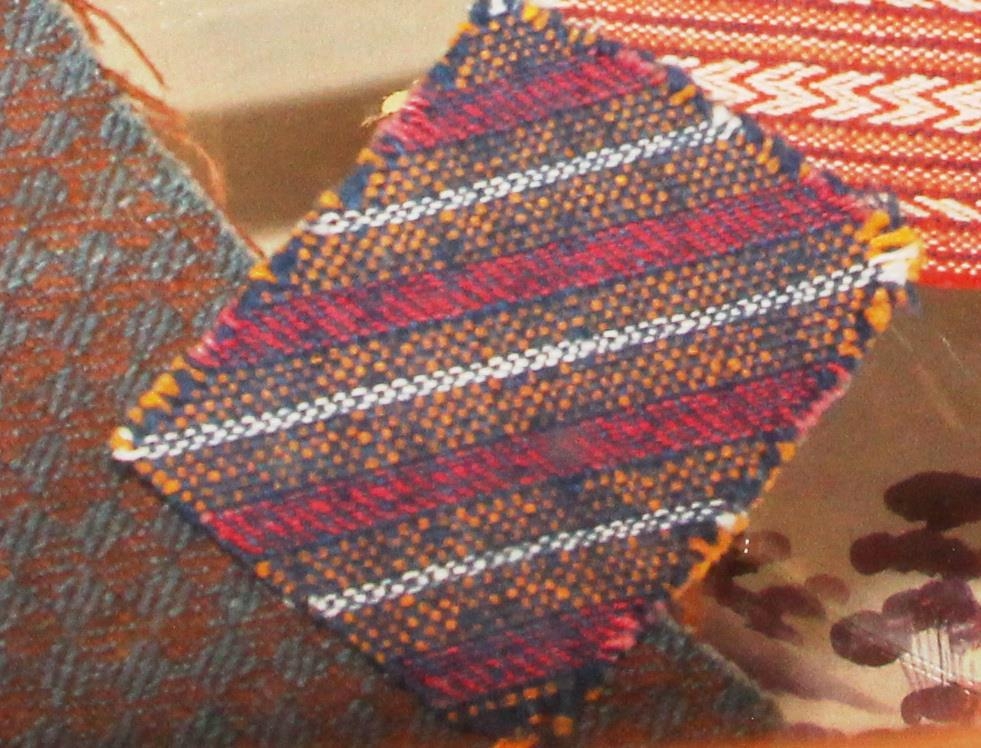 Vefnaður (sýnishorn). Ofið úr ull og bómullarþráðum. Litir: appelsínugult og blátt, hvítt og rautt. Símynstrað og röndótt. Fallegt handverk Guðmundar Péturssonar í Syðri-Hofdölum í Viðvíkursveit. Afhent af Halldóri J. Jónssyni en gefið af dóttur Guðmundar, Jenný (fædd 12.12.1899).
