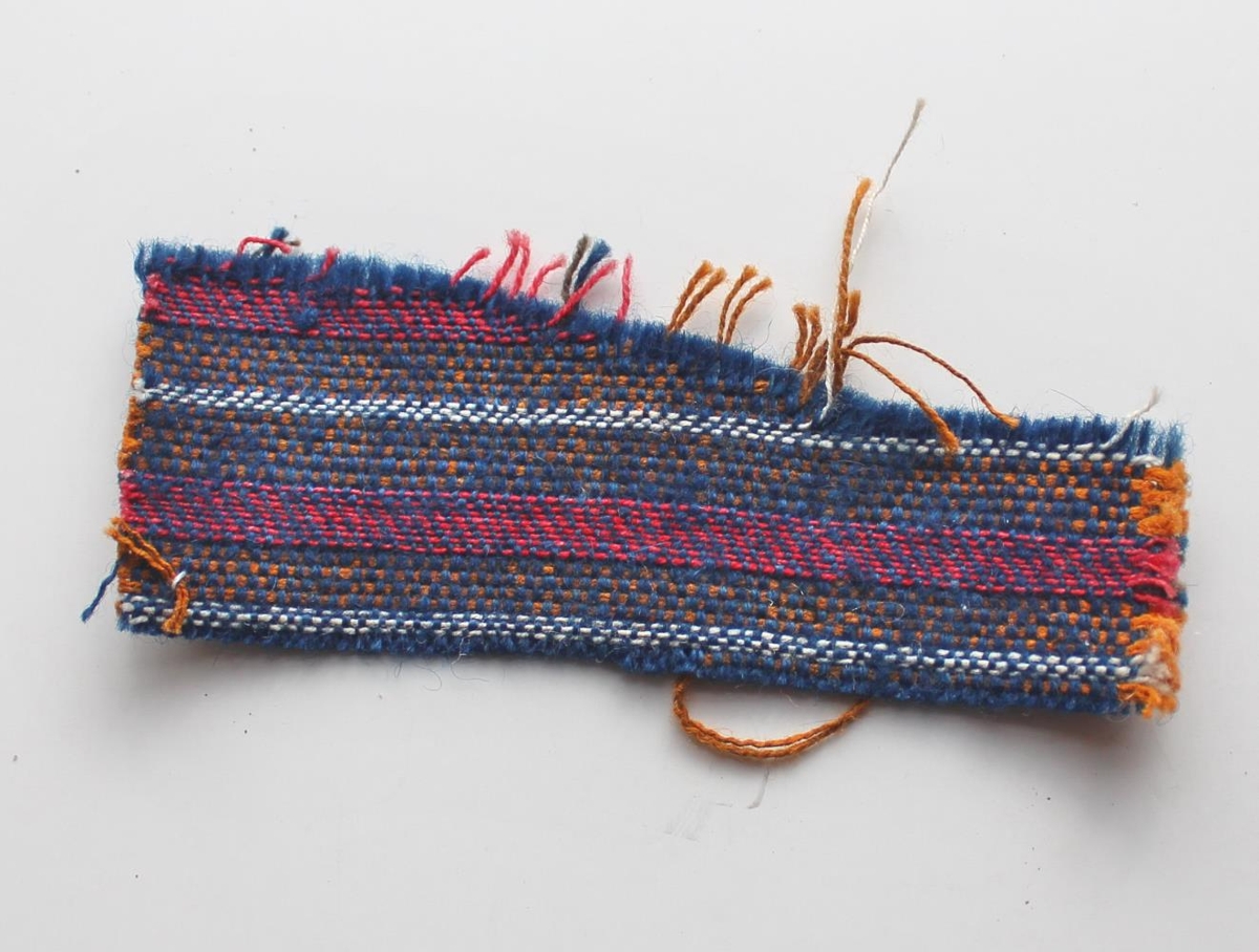 Vefnaður (sýnishorn). Ofið úr ull og bómullarþráðum. Litir: appelsínugulur, hvítur, blár og rauður (röndóttir). Tveir bútar misstórir, mislangar hliðar. Annar 6,1 x 4,7 cm og hinn 8, 2 x 3,2 cm.