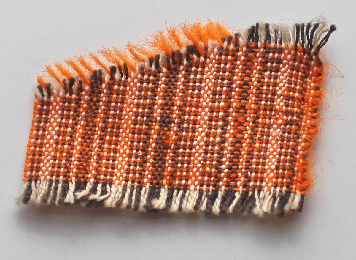 Vefnaður (sýnishorn). Ofið úr ull og bómullarþráðum. Litir: appelsínugulur, hvítur og brúnn (röndótt). Mislangar hliðar 4,6 x 3,2 cm.