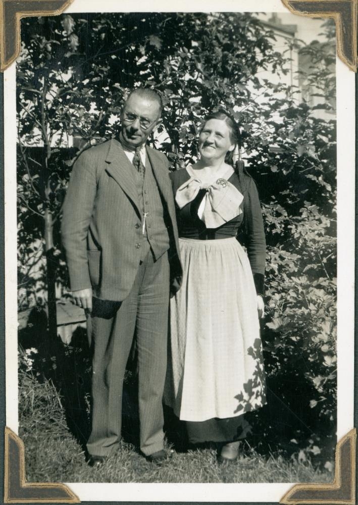 Karlmaður og kona standa við tré í garði, konan á peysufötum.