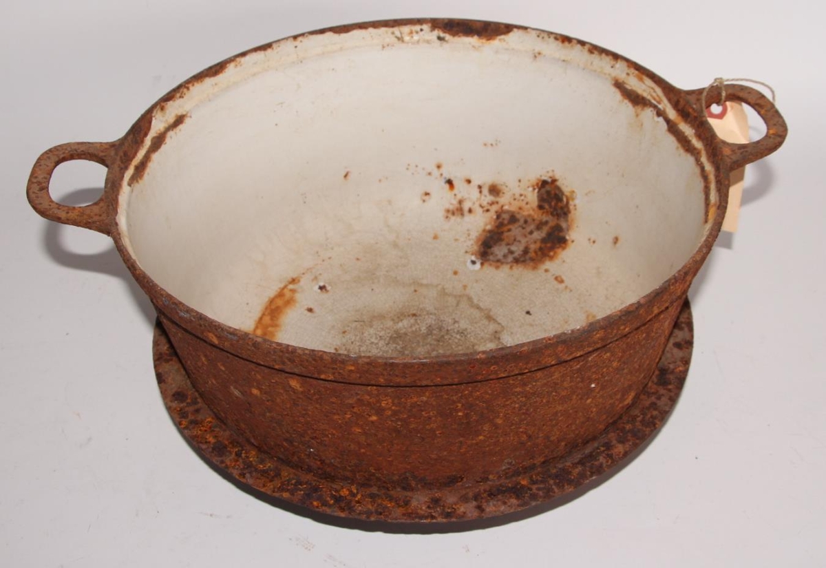 Járnpottur, emaléraður að innan, hvítur. Fyrir hringi á kola- eða olíuvél. Potturinn er um 17 cm á hæð og 35,5 cm í þvermál.