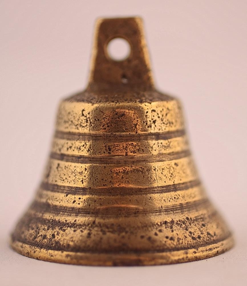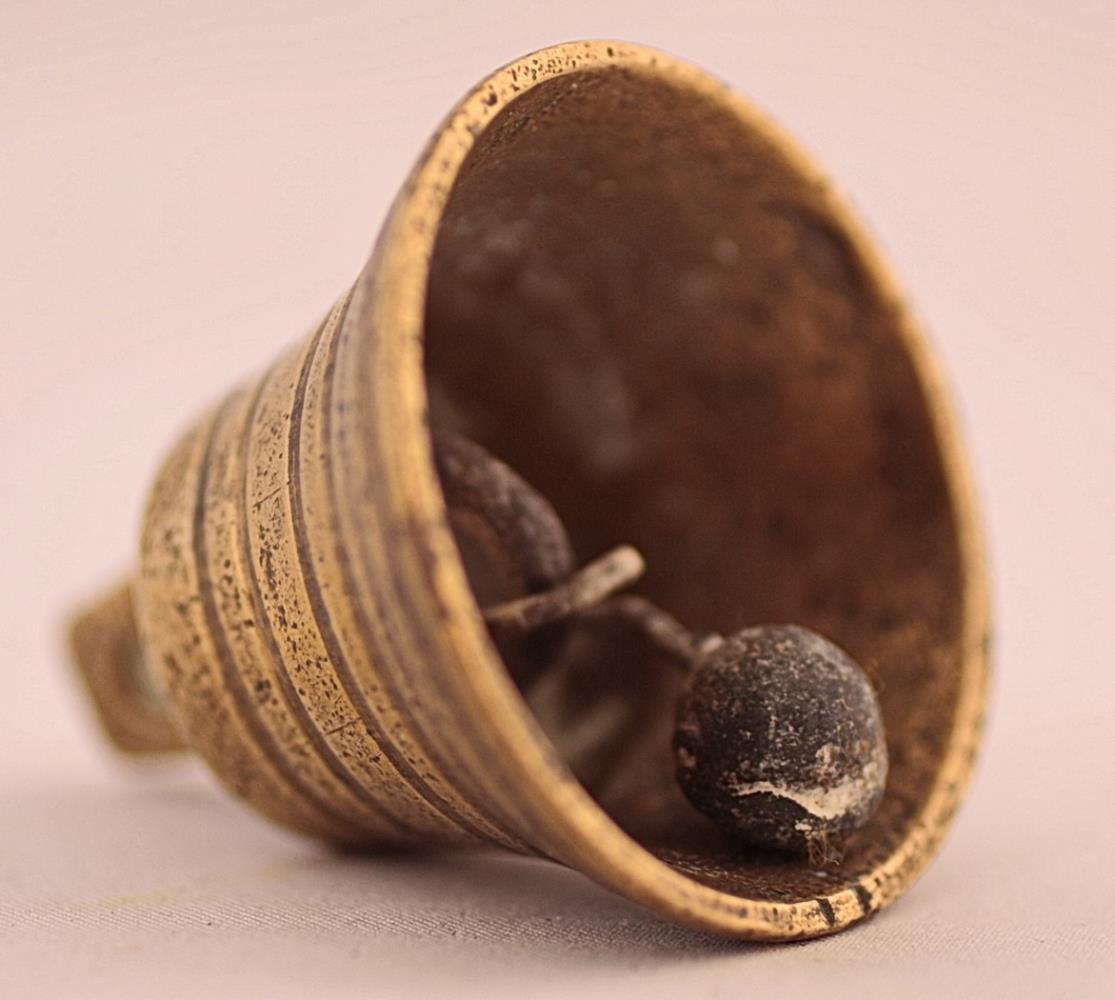 Sauðaklukka úr koparblöndu með blýkólfi. Forn höfð í hornum á „forystusauðum“.
