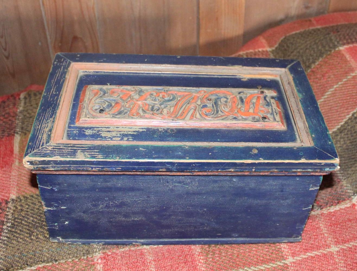 Kistillinn er prýðilegur gripur, en málningin lítillega máð af brúnum og smástykki eru felld í lok og bakið við lamirnar. Botninn er sprunginn.