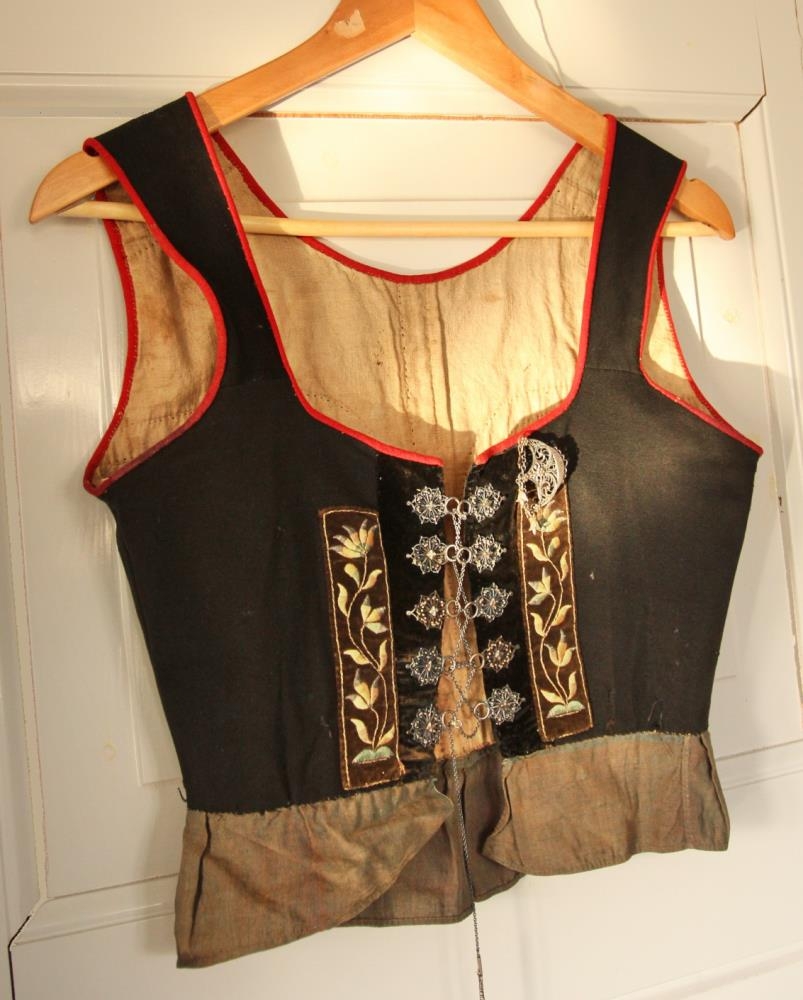 Handvegir og hálsmál eru brydduð rauðu vaðmáli. Um 1,9 cm breiðir borðar úr svörtu flaueli, ísaumaðir rauðu og grænu rósaverki, liggja eftir miðju baki og í boga út að handvegunum og liggja grannar vírsnúrur meðfram jöðrum þeirra.