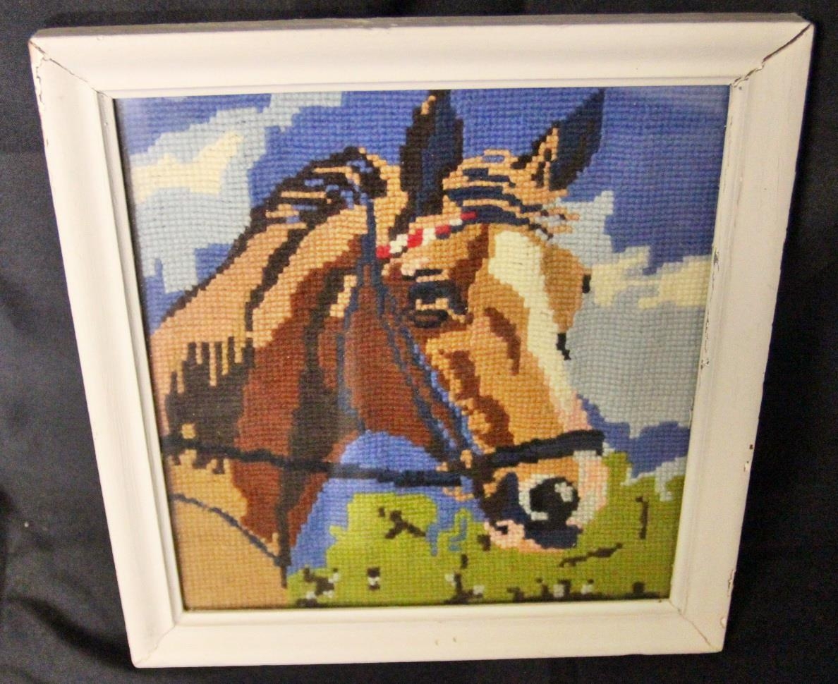 Útsaumuð mynd, í tréramma. Stærð 23,5 x 25,3 cm. Krosssaumað með ullarbandi. Blesóttur hestur. Grunnur er í bláum, hvítum og grænum lit. Hesturinn er í fjórum brúnum litum, blesan er hvít og bleik, beisli og múll svart og blátt og rautt í ennisbandi. Aftan á stendur: Handavinna Guðrúnar Sigmundsdóttur Vestara Hóli.