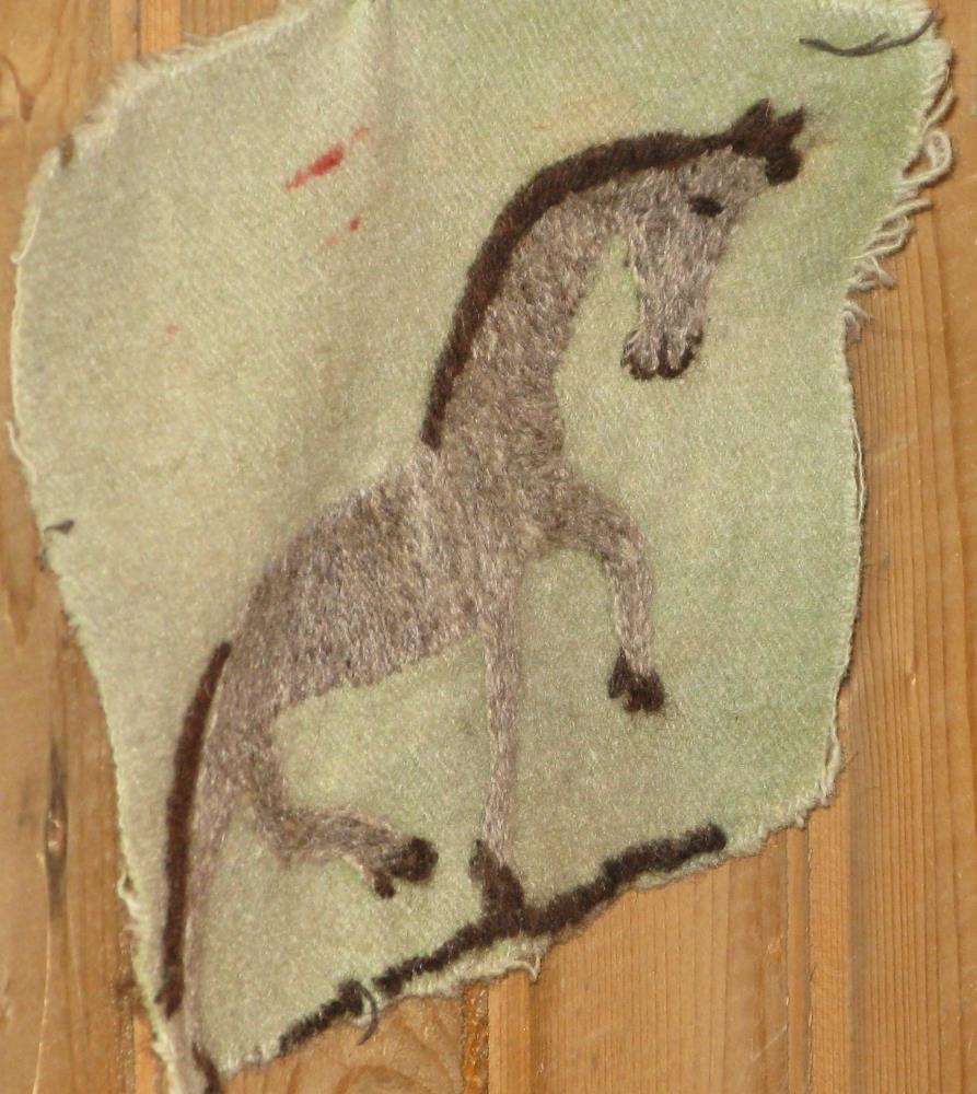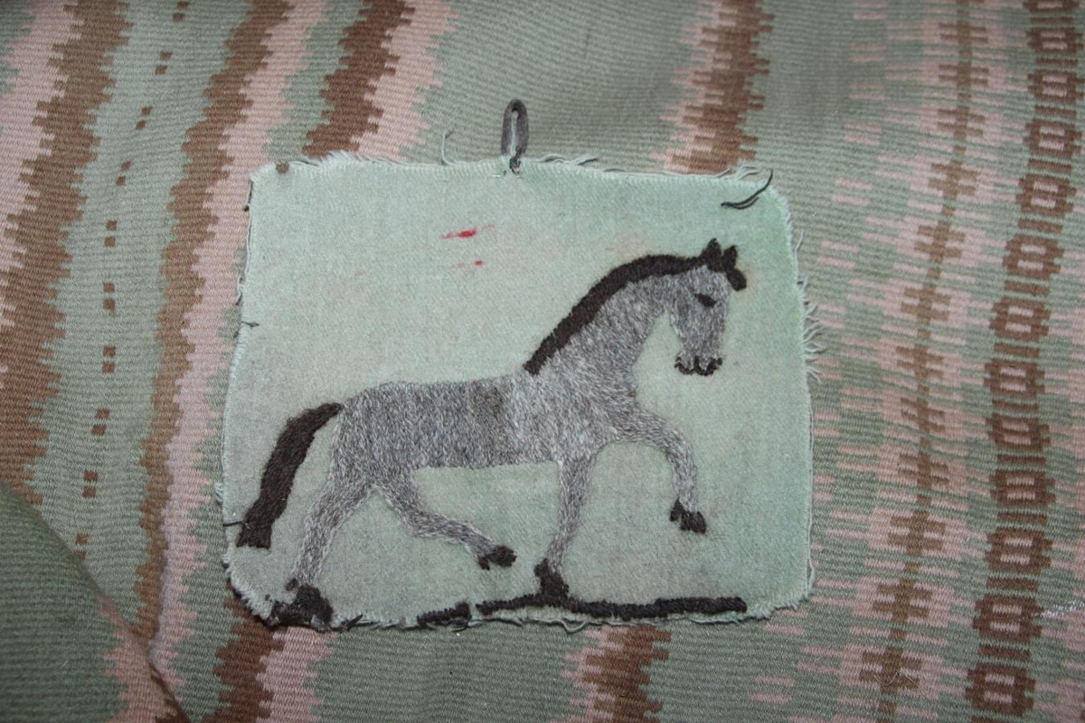 Mynd, saumuð í grænan klút með ullarbandi. Stærð 21 x 16,5 cm. Myndefni er grár hestur með dökkt tagl og fax. Útlínur eru saumaðar með kontórsting og fax og tagl með mislöngu spori. Sigurlaug Ingibjörg Sveinsdóttir húsfreyja að Hlíð í Hörðudal í Dölum (ættuð frá Mælifellsá í Skagafirði) saumaði myndina fyrir börn sín, Teit og Margréti Þorleifsbörn, sennilega á öðrum tug aldarinnar. Þau höfðu myndina alltaf við rúmið sitt og fengu stundum að leika sér með hana. Gefandi er Margrét Þorleifsdóttir, Háaleiti 56. Reykjavík.