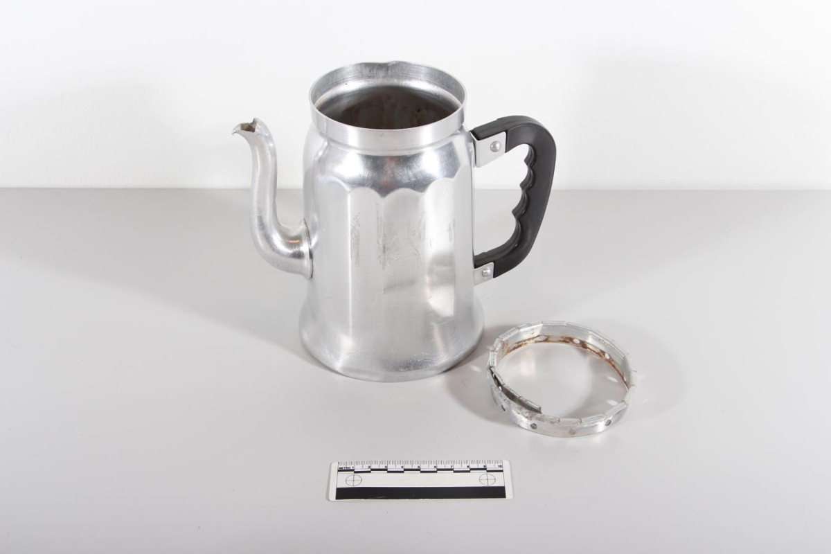 Kaffikanna úr áli með dökku nælonvöfðu handfangi. Hæð 18,2, þvm. mest 13 cm um botninn og hefur kannan "hálf bráðnað" af hita.