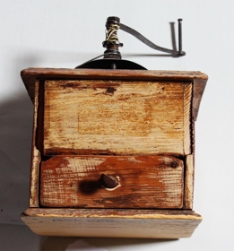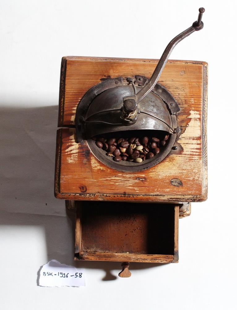 Kaffikvörn úr furu og járni. Hefur verið hvít eða ljós en liturinn er nú að mestur afmáður. Gulmáluð nýlega neðan á loki. Kvörn og hús úr járni ásamt sveif sem er með tréhaldi. Lokið vantar og skeggkanturinn er rifin . Búið er að festa húsið niður með vírum. Kvörnin er að öðru leyti í lagi.