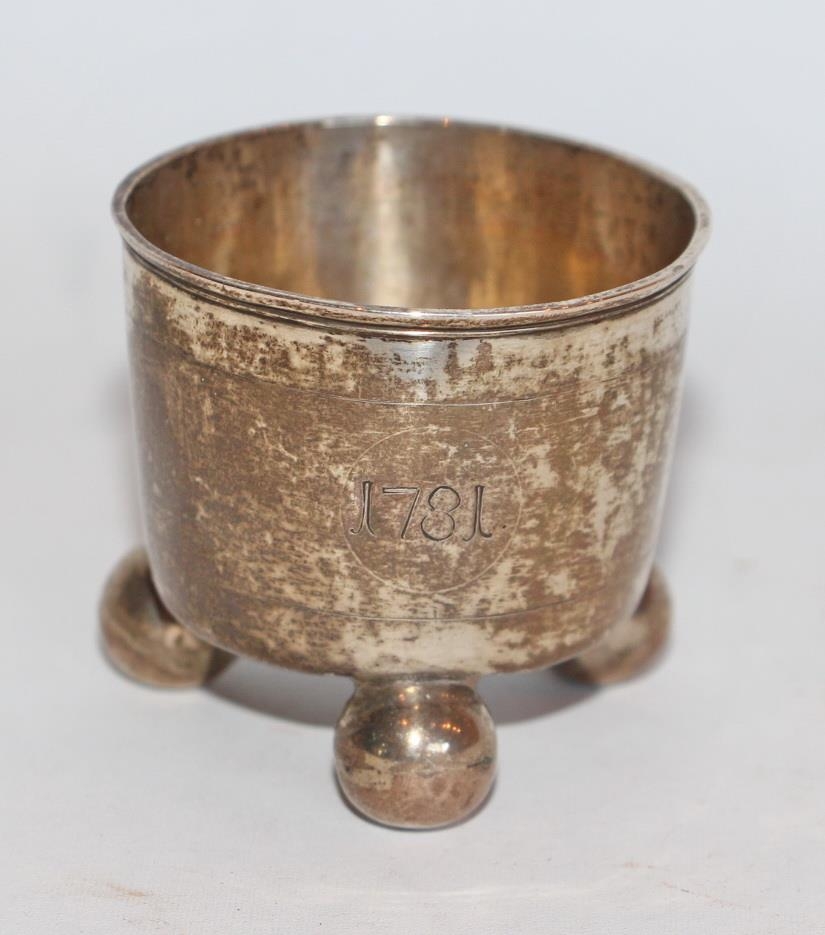 Staup úr silfri, staupið er næstum jafnbreitt upp og ofan og stendur á þremur kúlulaga fótum (holum að innan). 4,9 x 3,4 cm. Við efri brún, sem slær sér eilítið út, er tvískorið í. Um 0,5 mm frá brúnum ofan og neðan eru skornar rákir og einn um miðjuna á kúlufótunum, Á hliðum eru stafirnir JHS og ártalið 1781. Á botni eru tveir samskonar kringlóttir stimplar með stöfum IH eða HI (eftir hvernig snúið er). Staupið er dálítið máð og gamalt, fætur svolítið uppúr botninum eins og hafi verið þrýst á það.