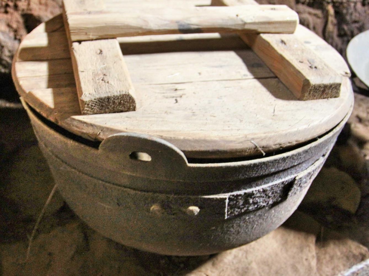 Pottur úr steypujárni, hæð á brúnir af gólfi 20 cm. Þvermál 41,2 cm. Tveir fótstubbar, afar litlir. Potturinn er hrörlegur, allur sprunginn, tvö göt á botni (annað mjög stórt) og potturinn er spengdur hringinn.