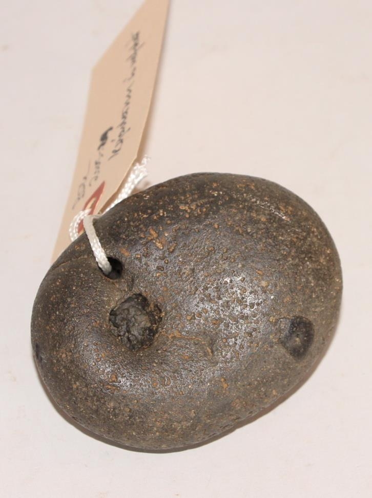 Kljásteinn úr blágrýti, hnullungur með litlu gati til að hengja upp í vefstað. Stærð hálf egglaga steinsins er 8,5 x 6,7 x 4,2 cm. Gatið er í gegn um þykka ,,brúnina".