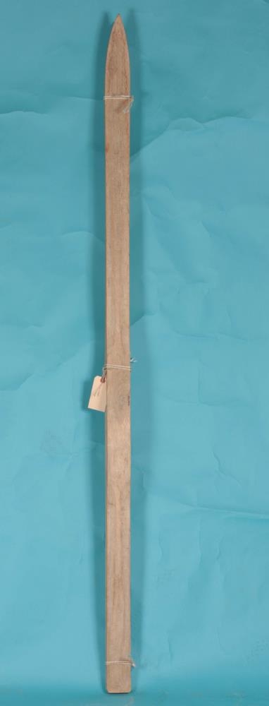 Skíði úr eik. Breidd 6,5, lengd 185 og 2 cm þykk í miðju, mikið flegið af þeim til endanna. Táin er oddmjó og vísar upp. Bindingar eru engar en göt fyrir tábindingar eru á skíðunum.