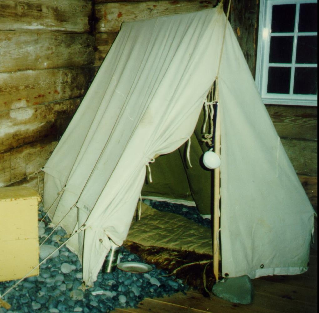 Tjald úr segli, hvítt að utan en "navy" grænt að innan og hefur sennilega einhvern tímann verið allt í þeim lit. Stærð 180 cm. Það er sennilega frá tímabilinu 1925-1935 og var notað við vegavinnu fyrst. Seinna í hitt og þetta, t.d. útilegu.