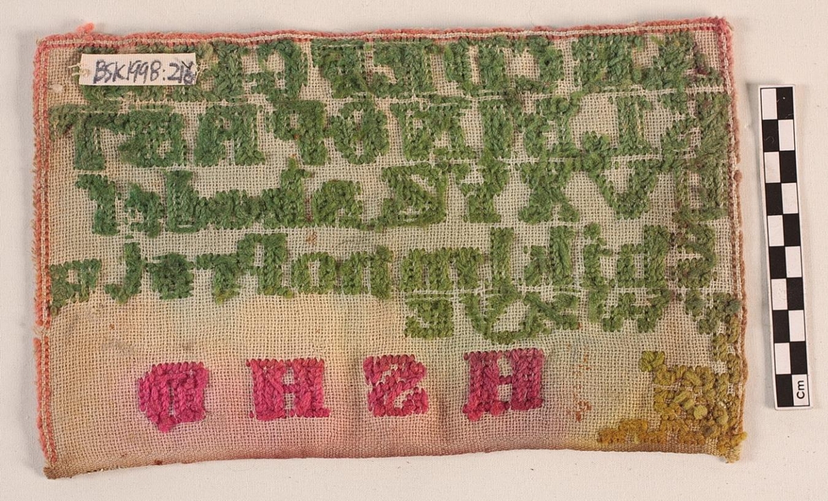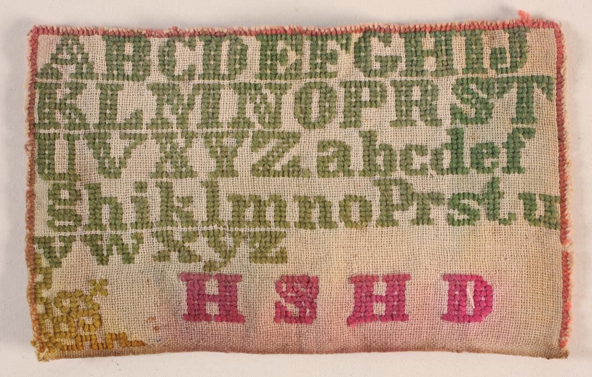 Stafaklútur, saumaður í 22 x 13,4 cm ljósbrúnan hörjafa. Rauður kantur er við brún, stafirnir HSHD eru bleikir, en það eru kennistafir Hansínu Sigríðar Hannesdóttur frá Hólum í Fljótum (f. 1887). Ljósgrænt skraut er í hægra horni. Stafrófið, bæði stórir stafir (A-Z) og litlir (a-z) eru saumaðir með grænu bandi. Gefandi er Jóna Guðmundsdóttir frá Berghyl.