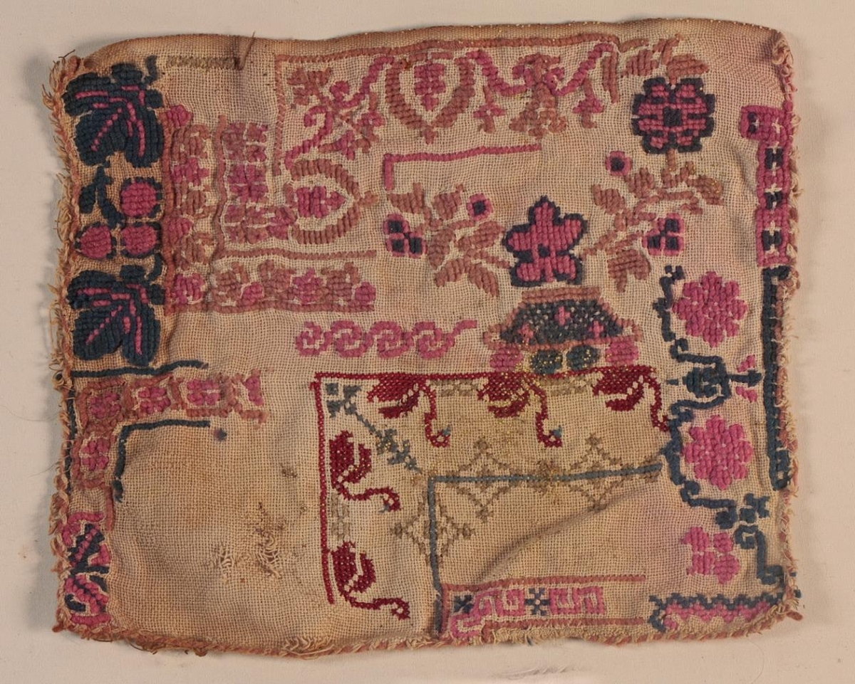 Útsaumaður hörklútur. Stærð 24 x 21 cm. Sigríður Hannesdóttir á Hólum í Fljótum saumaði myndina, sem er saumuð með krosssaumi í bleikum og bláum lit aðallega. Aðrir litir eru: ljósbrúnt, grátt og rautt. Mest blómamynstur og álftir (rauðar).Gefandi er Jóna Guðmundsdóttir frá Berghyl í Fljótum.