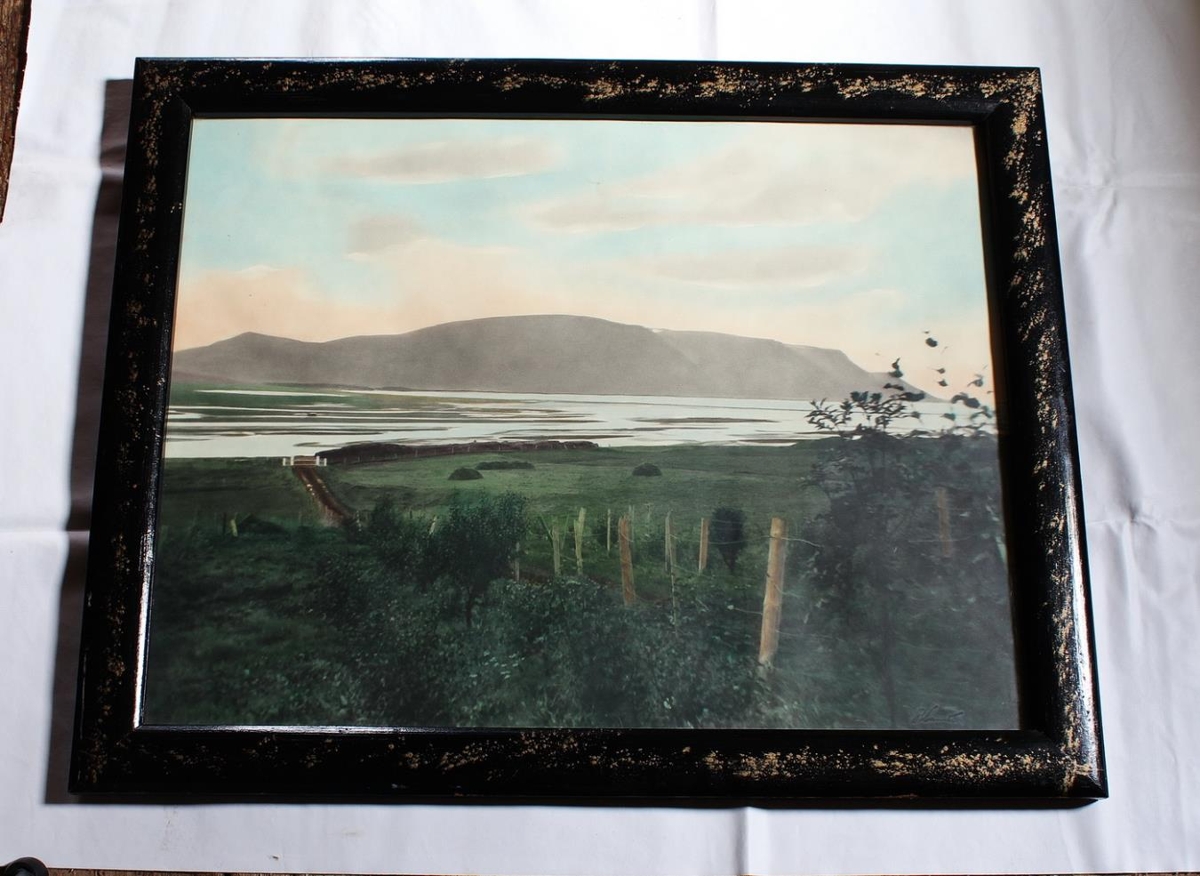 Mynd (lituð ljósmynd) í ramma. Ramminn er svartur með gylltri skreytingu, 65,5 x 52 cm. Myndina tók Pétur Hannesson. Myndin er tekin af hlaðinu á Hellulandi yfir á Sauðárkrók og sýnir flóð í Héraðsvötnum.