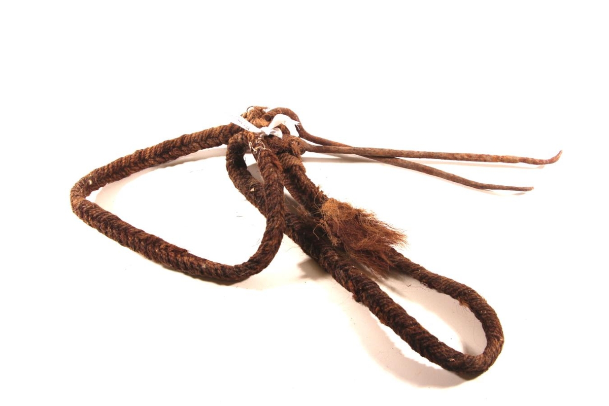 Kaðallinn eða fléttað bandið sem er úr hampi og orðið dökkbrúnt að lit er um 150 cm langur.