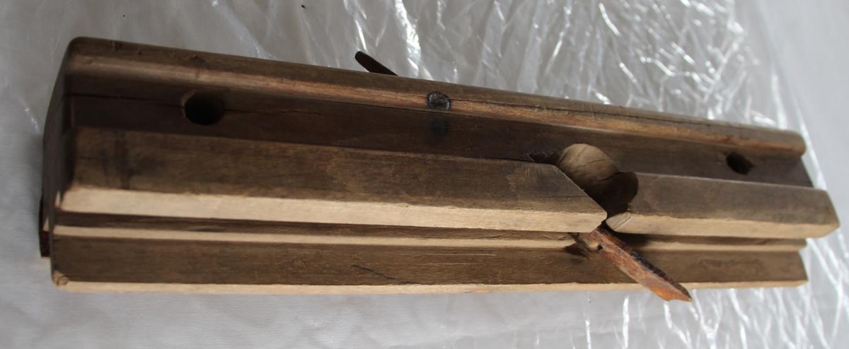 Plóghefill úr brenni, tvöfaldur en vanta járntennurnar. Lengd 40 cm, breidd 8 cm og þykkt 7 cm. Vantar handföngin.Úr eign sömu manna og nr. 828. Kom á safnið 7. júní 1970.