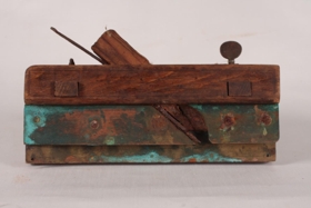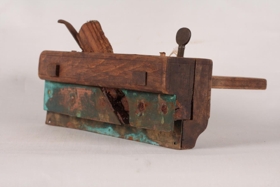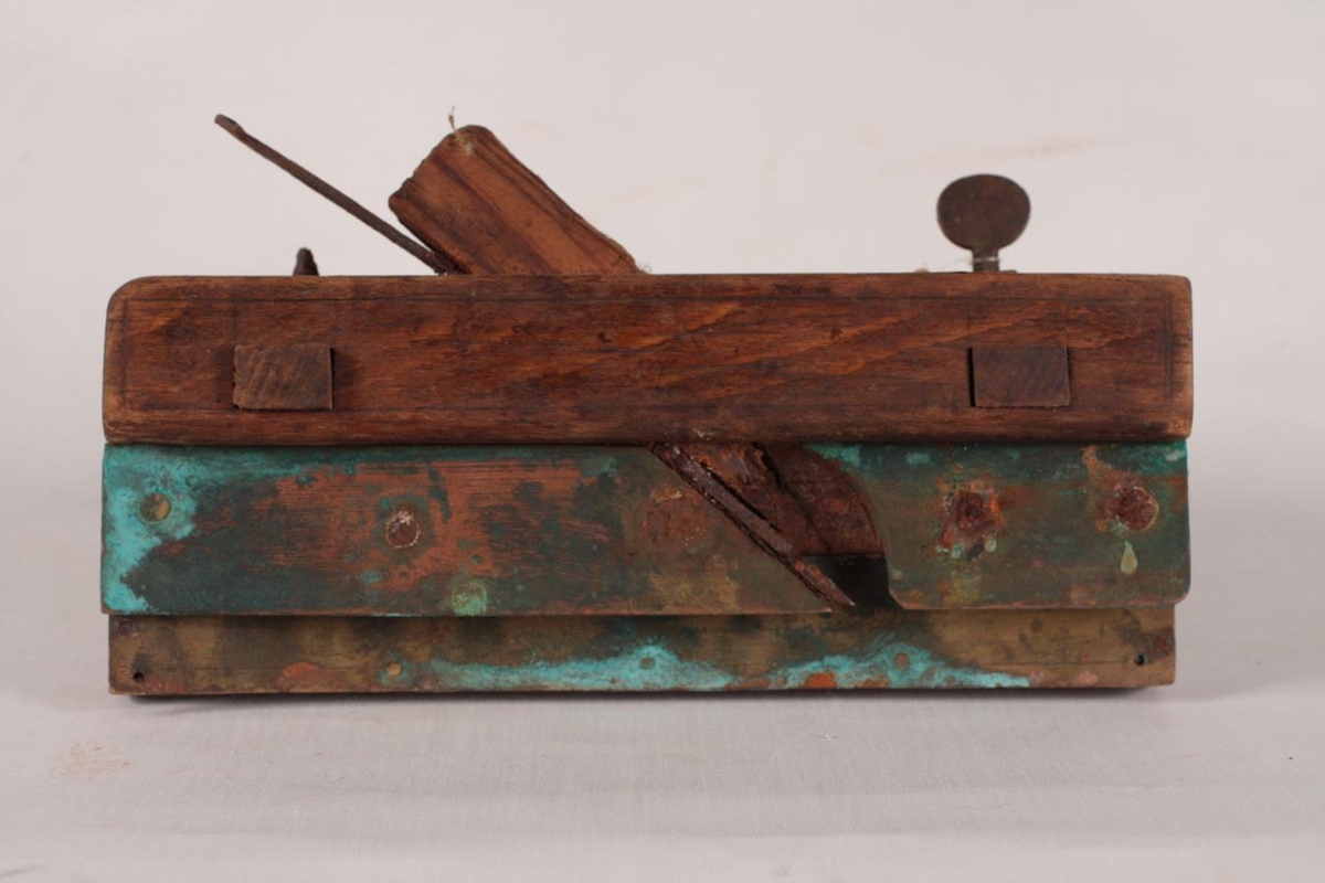 Plóghefill úr brenni með látúnsskinnum og látúnsskrúfum. Lengd 23 cm, breidd 9 cm og þykkt 6 cm, með tveim handföngum með þumlunga máli til stillingar á plógfarinu. Járntönn og strik á hliðum til skreytingar.