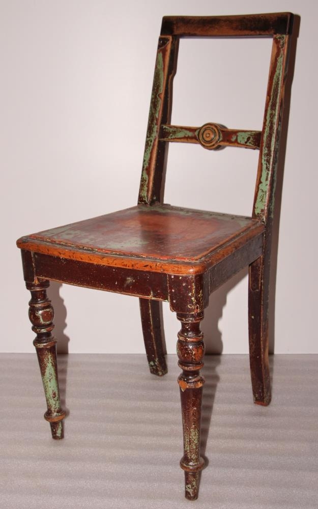 Stóll (bakstóll) úr furu, hefur verið dökkbrúnn en málað yfir með ljósgrænu. Hvoru tveggja orðið mjög afmáð. Framfætur eru renndir snoturlega og einnig hálf kúlulaga á millibandi í baki stólsins. Annars er stóllin afar einfaldur að allri gerð. Setan er úr tré og negld föst. Fætur að aftan eru mjög lausir í.