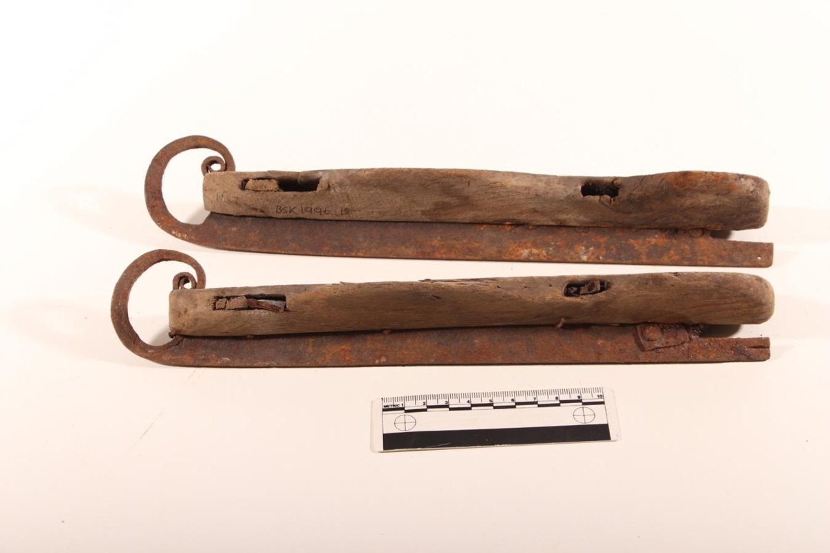 Skautar úr furu og járni. Iltréð er fótlaga, 31 cm langt. Heimasmíðaðir. Járnlykkja vefur sig upp að framan.