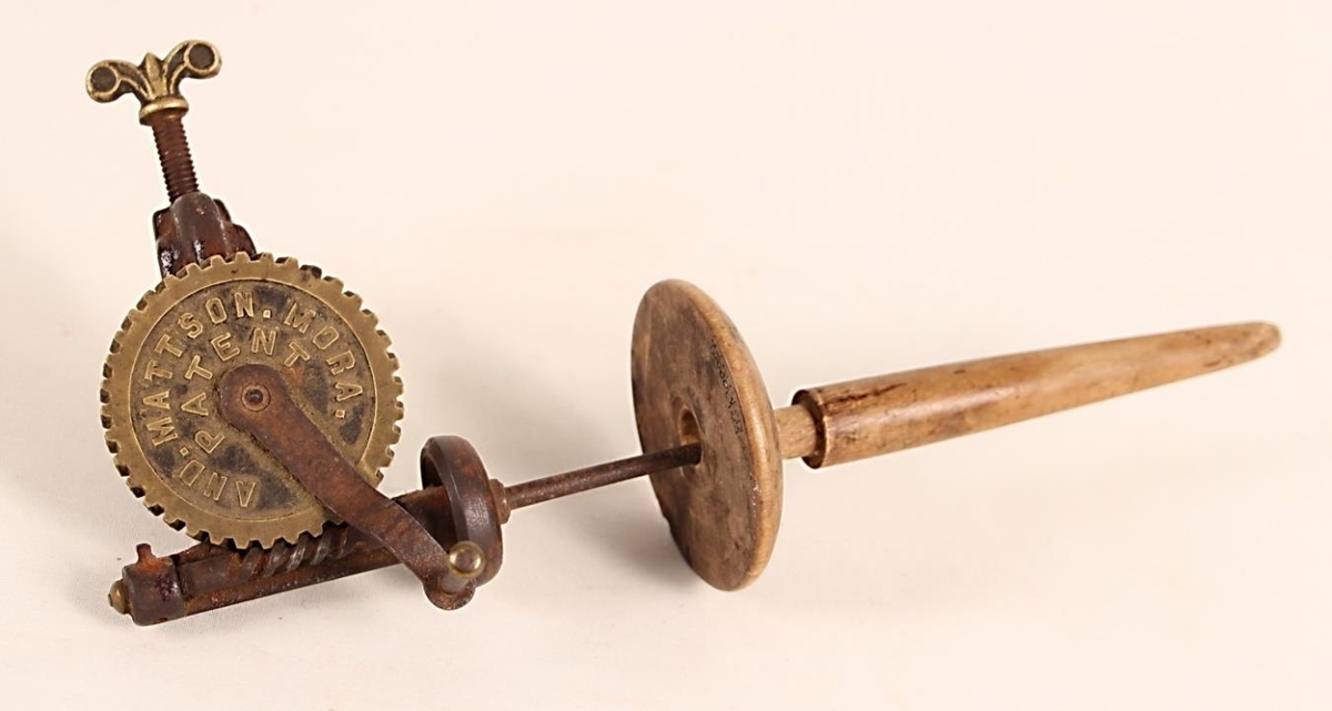 Spunarokkur, járnverk með tannhjóli úr kopar. Á 29 cm löngum járntanga er rennd trésnælda með tréskrúfu sem er 7 cm í þvm. Á skrúfnagla skrúfstykkis, til að festa rokkinn á borðbrún er koparlauf. Í víðustu stöðu er breidd skrúfnagla + skrýfstykkis 14 cm. Á tannhjólinu stendur: AND. MATTSON. MORA. PATENT. Notað við að snúa bandi, til að tvinna, þrinna o.fl.