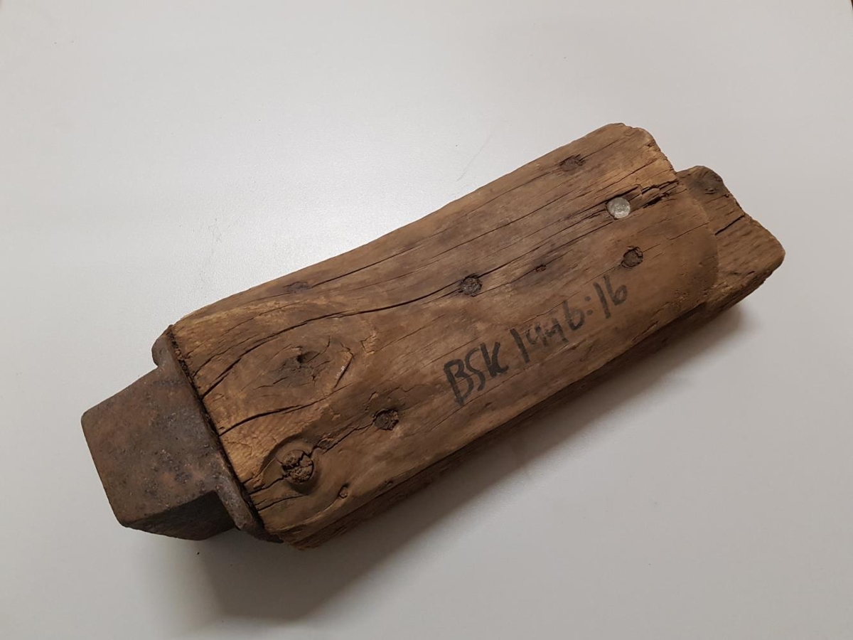 Klöppusteðji úr járni. Stærð 12 x 4,8 cm. Negldur á trébút með fjórum nöglum sem negldir eru í göt (tvö) sitthvoru megin á skegg sem slegið er út neðst til að festa steðjann á einhverju.