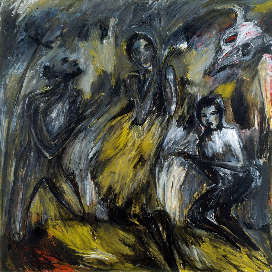 Jóhanna Kristin Yngvadótti Ein ungewisser Augenblick 1987 Öl auf Leinwand 190 x 190 cm Privatsamlung [vélritað á pappaspjald, spjaldið tekið af 2013 og geymt með lánssamningum]