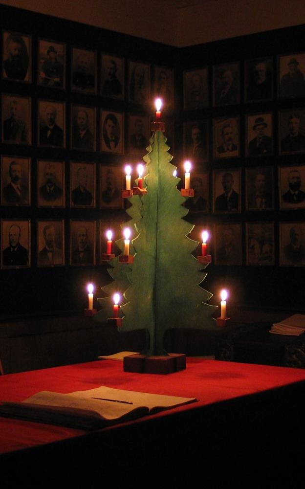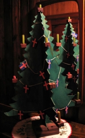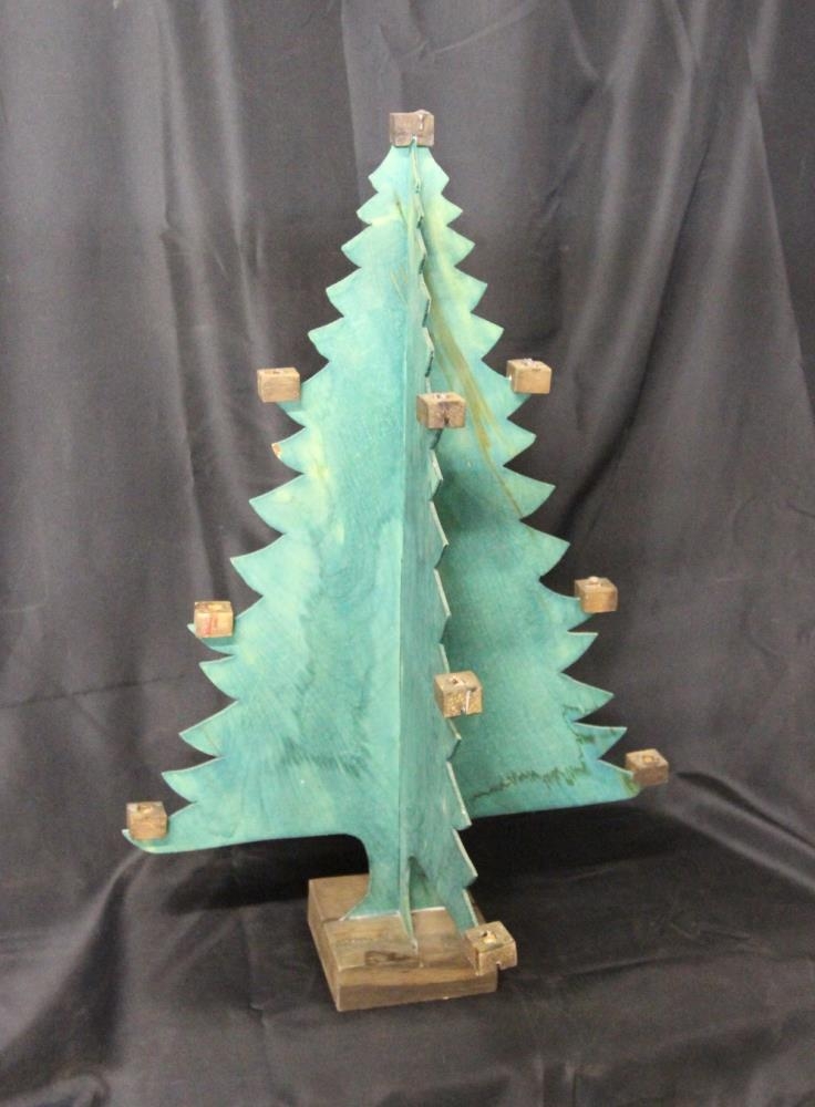 Jólatré úr krossviði, útsagað, grænmálað á brúnum kvistuðum fæti. Tréð er útbúið úr tveimur plötum sem sagaðar eru út eins og tré og smeygt saman þannig að þær mynda 90° horn og má því segja að tréð sé ferkantað. Trénu fylgdu tólf fléttaðir brugðnir jólapokar með ýmiskonar mynstri. Litlir dökkbrúnir kubbar fyrir kerti, tólf að tölu eru festir á hliðar trésins. Sá þrettándi er fyrir efsta ljósið á toppnum.