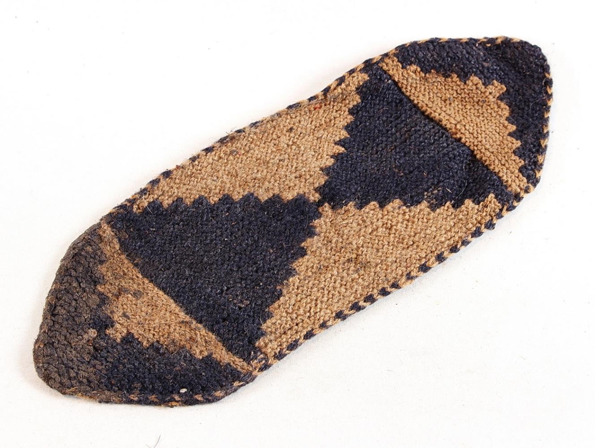 Skóleppar eða illeppar frá Völlum. Prjónaðir með garðaprjóni, bláu og ljósbrúnu. Lengd 26,5, breidd 11 cm. Mynstur kemur saman á oddum á miðjum lepp. Heklað utan með.
