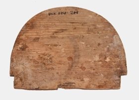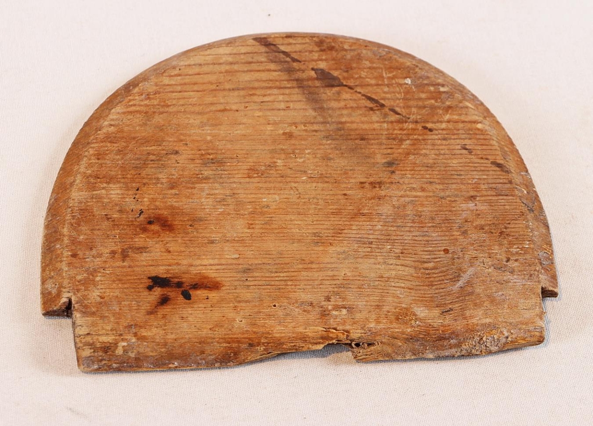 Lok úr furu, hálfhringlaga. 13,1 x 10,6 cm. Stykkinu hefur verið smeygt inn á og fyrir. Þunn plata sem gæti þess vegna einnig hafa verið notuð sem botn.