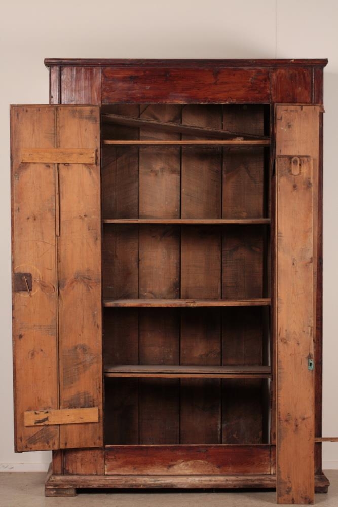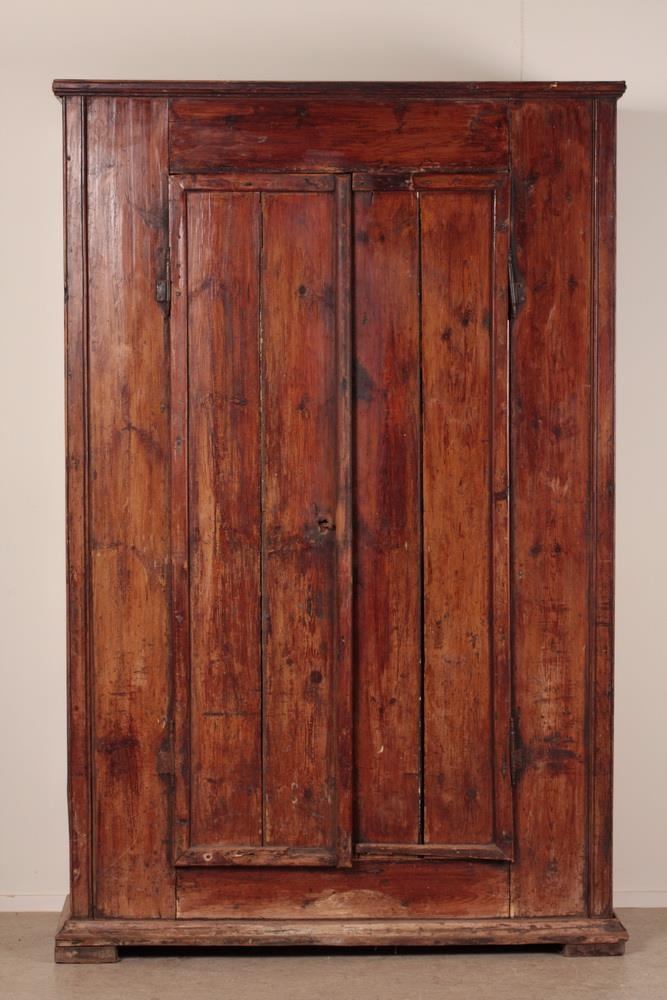 í skápnum. Skápurinn er brúnmálaður og hefur verið gert við hann á annarri