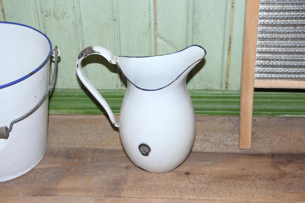 Vatnskanna, emaléruð hvít með blárri rönd á börmum. Túðubreið með löngu handfangi. Töluvert hefur kvarnast úr henni. Mesta hæð á túðu 26,8 cm, minnsta 22 cm. Hæð á hald mest 27,8 cm. Hún er um 17 cm í þvermál um belginn þar sem hún er víðust. Það eru 8 skellir á könnunni og gat á botninum. Frá Völlum.