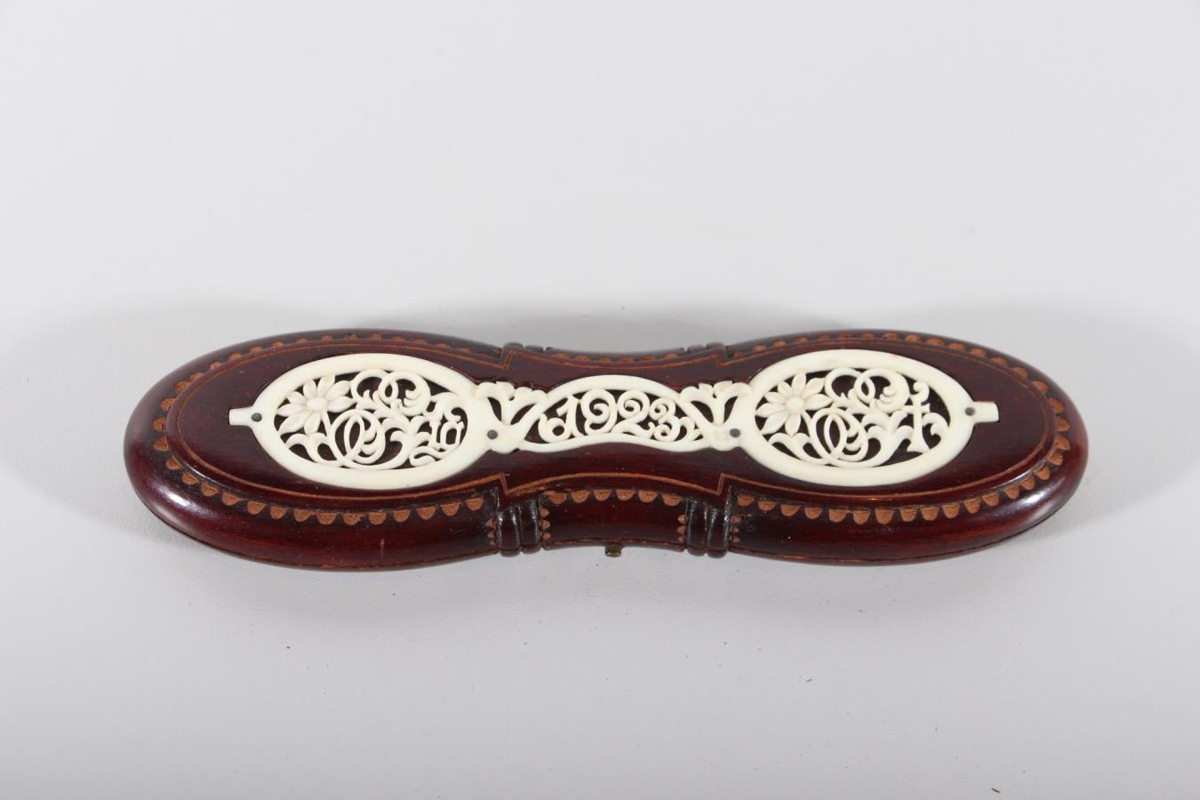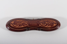 Gleraugnahulstur, 17,5 x 4,7 cm. Mikið útskorinn gripur. Á annarri hliðinni er útskorið blómsturmynstur eða laufbekkur og "Vigur" fyrir miðju. Hinu megin er útskorið flúr úr beini, í laginu eins og gleraugu. Í útskurðinum eru blómsturmyndir, hægra megin eru stafirnir "Sig" og fyrir miðju ártalið "1923" og svo vinstra megin "St".