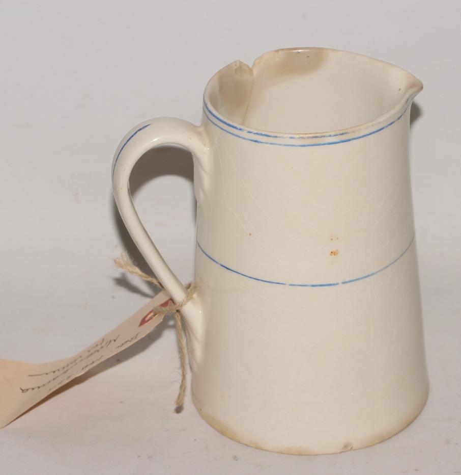 Mjólkurkanna, úr leir. Hvít með örfínum bláum röndum um miðju og efst. Stutt og lítil. Hæð 13,7 cm. Þv. neðst 9,7 cm. Á botni er merki með rísandi sól. Á því stendur m.a. „VITRESOL“ og „J“ og „G“ „Meaking England“. Einnig er markað í leirinn talan 36.