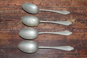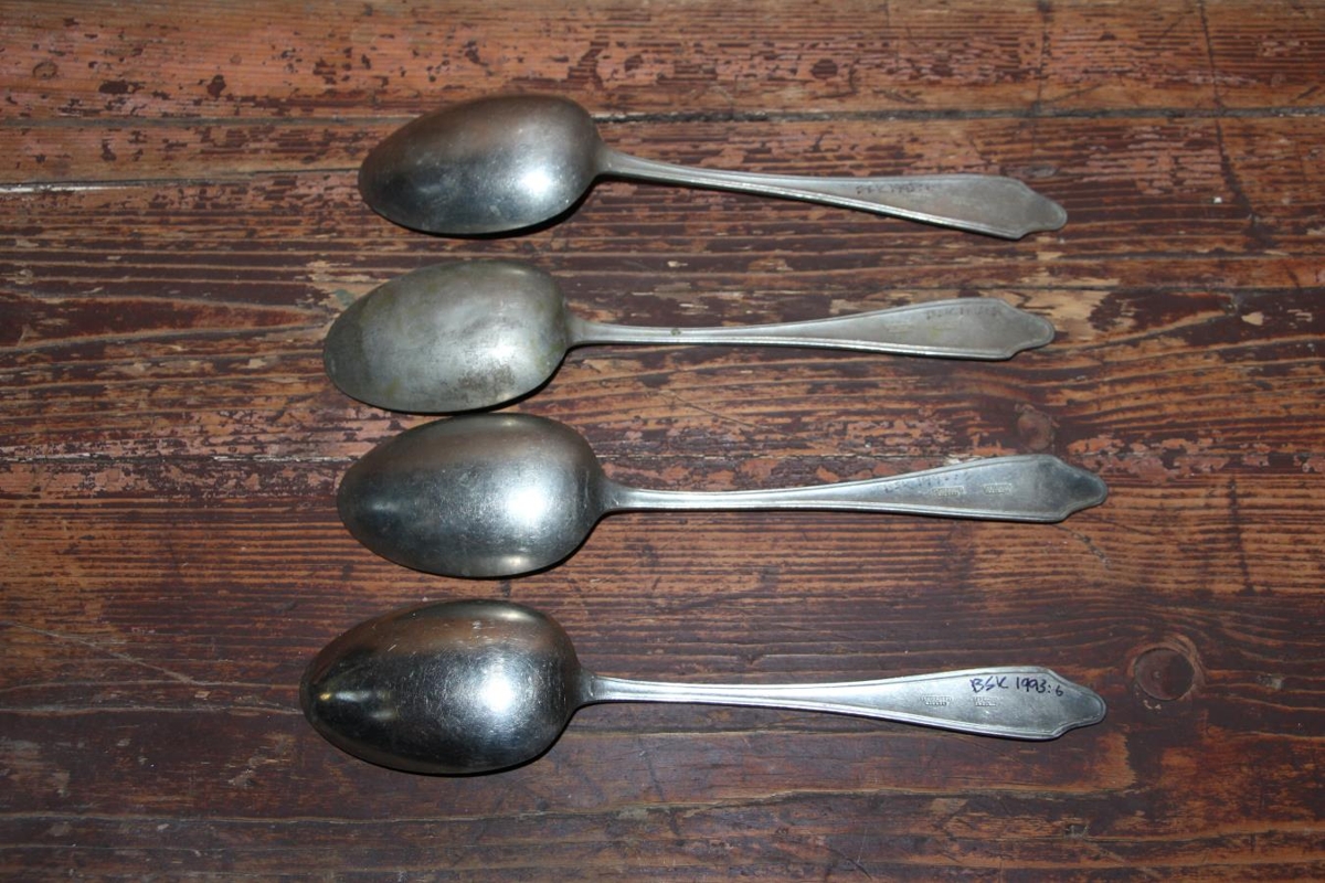 Matskeiðar, 5 stk, nikkelhúðaðar, lengd tæplega 21 cm. Aftan á eru stimplar „STAIN-LESS NICKEL“ og „SHEFFIELD ENGLAND“. Skeiðarnar eru strikaðar á brúnum með hring á endanum. Úr búi Ingibjargar Bjarnadóttur á Völlum. Gefendur eru barnabörn hennar.