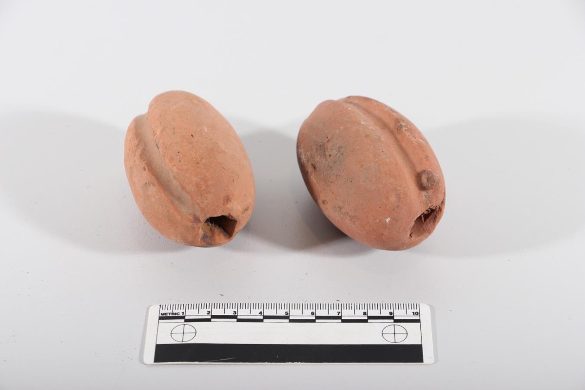 Sökkur úr rauðleitum sandsteini (2 stk). Útlendar. Lengd tæpir 8 cm. Sporöskjulaga með „fals“ fyrir kantsnærið. Af silunganeti frá Völlum í Vallhólma.