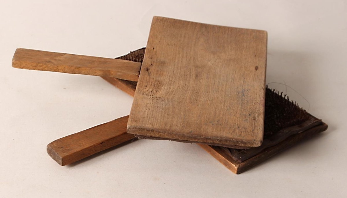 Ullarkambar, úr furu, skinni og járntittum. Venjuleg gerð. Stærð 22 x 12,5 cm, haldið er 13 cm langt. Kambar til að kemba ull.