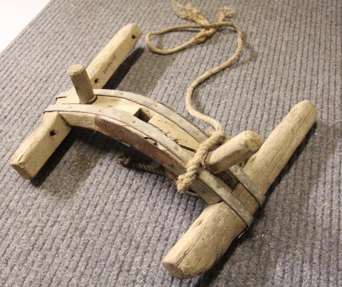 Klyfberi úr furu, spengdur með járngirði. Óvenju víður og allur hinn stórgerðasti. Stærð 47 x 53 cm. Miðklakkinn vantar. Þrjú göt eru fyrir ólarnar. Gamallegur.